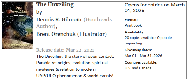 Month of March 2026 draw – win 1 of 20 hard copies of my sci-fi novel, “The Unveiling: the story of open contact”